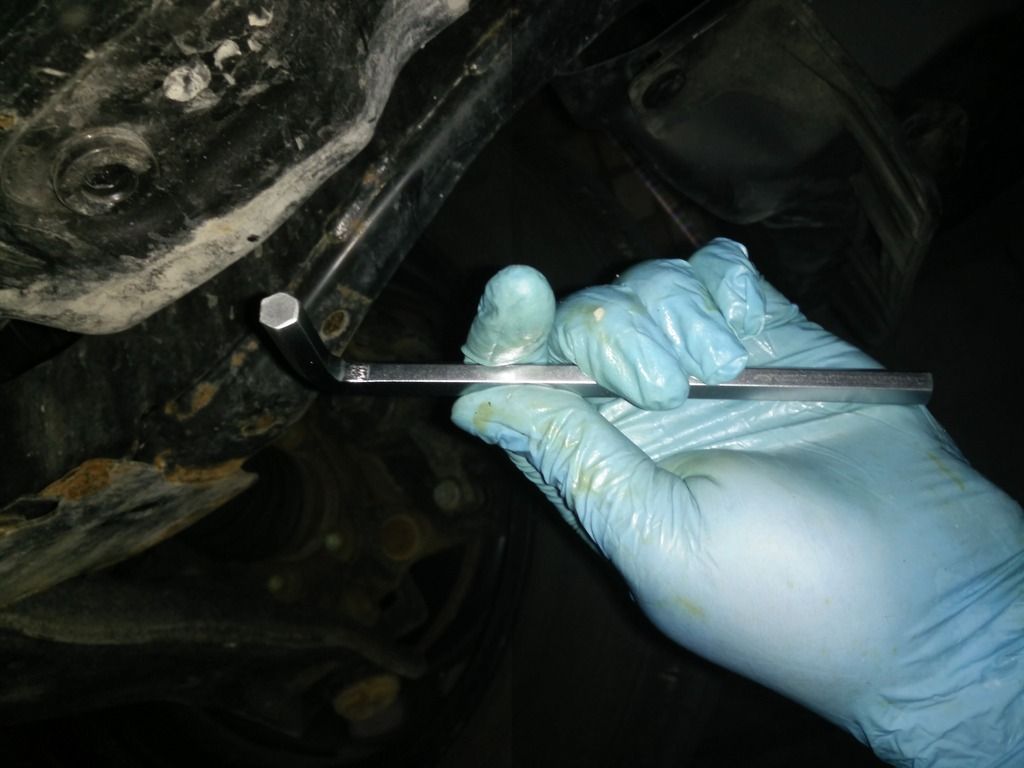 Step 3- Locate the transmission pan, use the 8 mm hex wrench or socket to remove the transmission drain bolt and drain the fluid.