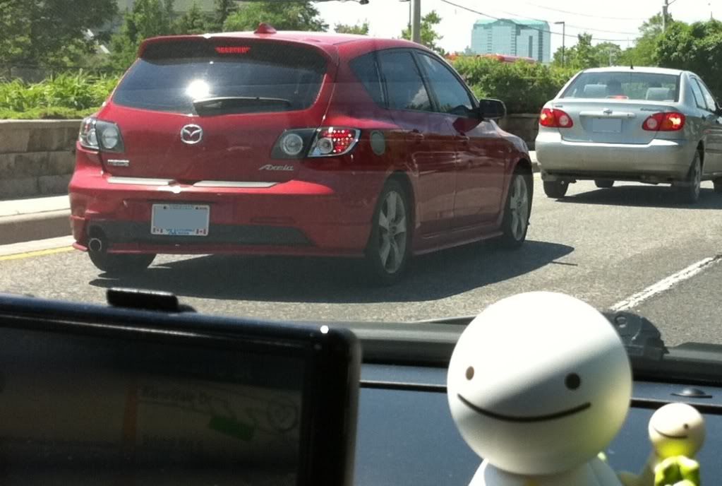 04-05 Tit Grey hatchback with Axela badge and sharkfin. Pulled over by some pig cop on the DVP (10:40PM) after Bayview/Bloor exit.