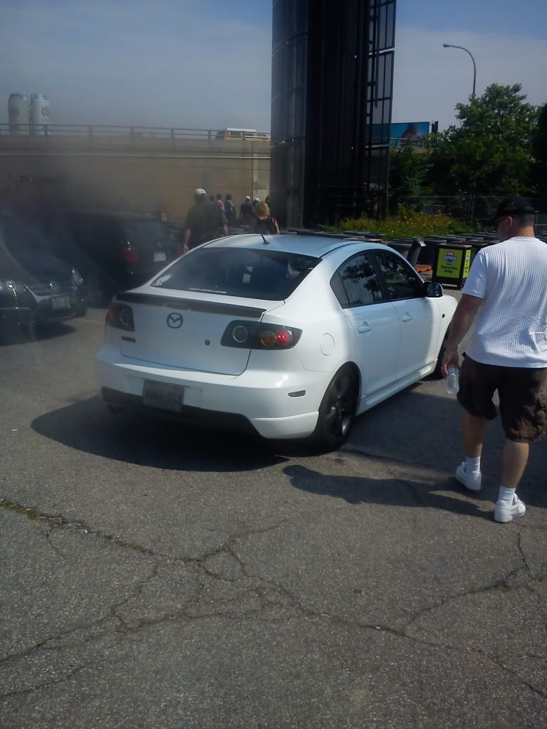Today (Sunday, July 10) at about 6:30 pm in Barrie on the 400.... white hatch... blacked out emblems, Axela badge, TM3 plate cover, assorted decals on the window. Unless you were keeping an eye out for sand-coloured Dodge Caravans you wouldn't have noticed me :)