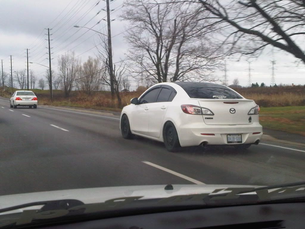 2nd gen white Mazda3 hatchback GT-E on Hwy7 going east on Kennedy today (10:05pm). Tint, lowered, nextmod sticker on rear window & Konig Illusion rims (blue accent) VERY NICE! You looked over at me when we were stopped at the red light. I waved but I'm not sure if you could see me since we both had tint along with the freezing rain.