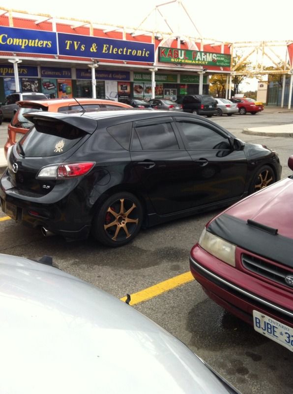 Silver 1st gen sedan, lowered, rims, open grille, torontomazda3 sticker on the windshield; parked at Eurasia. You work there or were you getting your car repaired? There is also a 1st gen red MS3 with rims/lip kit/exhaust parked there, but didn't see any tm3 markings on the car.
