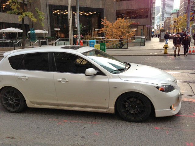 Just now..... Spotted a larked grey 2010+ Mazda3 sedan. Stock height on steelies, tinted windows and rear tail lights. Also blacked out front and rear emblems. This is by Wild Wings parking lot in Heartland... Mississauga.